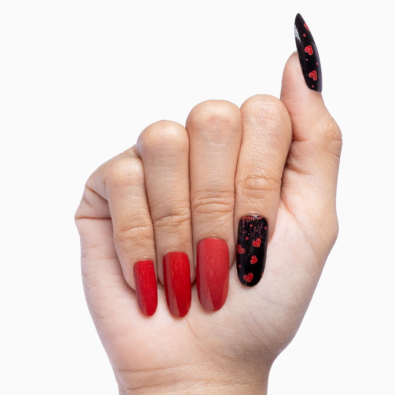 Wrap up your nails in cozy Christmas Pajamas, featuring a glossy red and black buffalo plaid background with snowflakes and playful transparent stripes to give a peek at your natural nails. Apply in minutes for a mani that gives Christmas morning vibes for weeks.