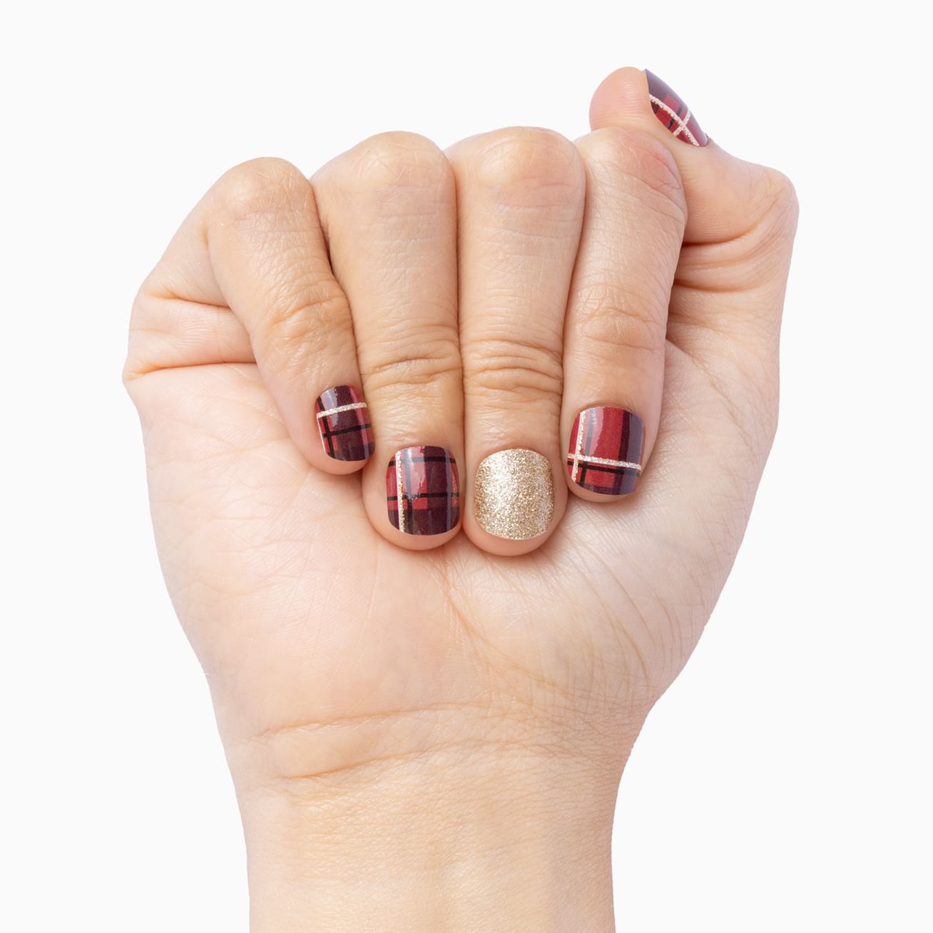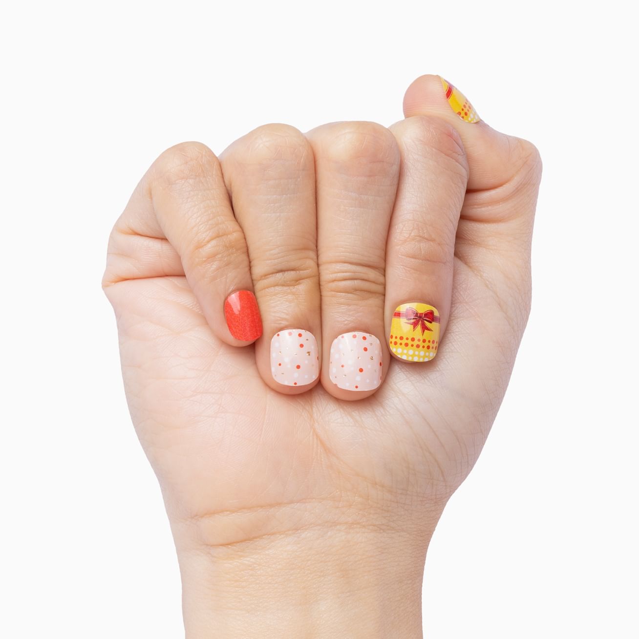 Let Rudolph lead the way to this whimsical wrap set that includes golden sparkles with white hearts at the cuticle, a sleepy reindeer with golden antlers and a red nose set against a pale pink background, and glitter-kissed snowflakes set against that same rosy pink. You must be on the nice list - these nail wraps apply in moments and can hold up to gift wrapping (and unwrapping) and all the holiday activities that keep you jingling all the way!