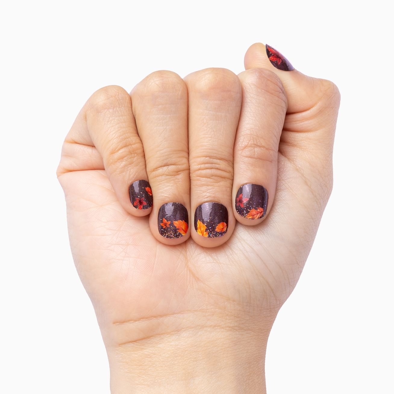 Blow Me Away combines gold glitter accents with windswept maple leaves, boughs, and branches for a manicure that says, "it's fall, y'all." With the design right at the cuticle, these are picture-perfect on short nails and give glam leaf peeps on longer fingertips. You'll be blown away by how quickly and easily these can be applied.