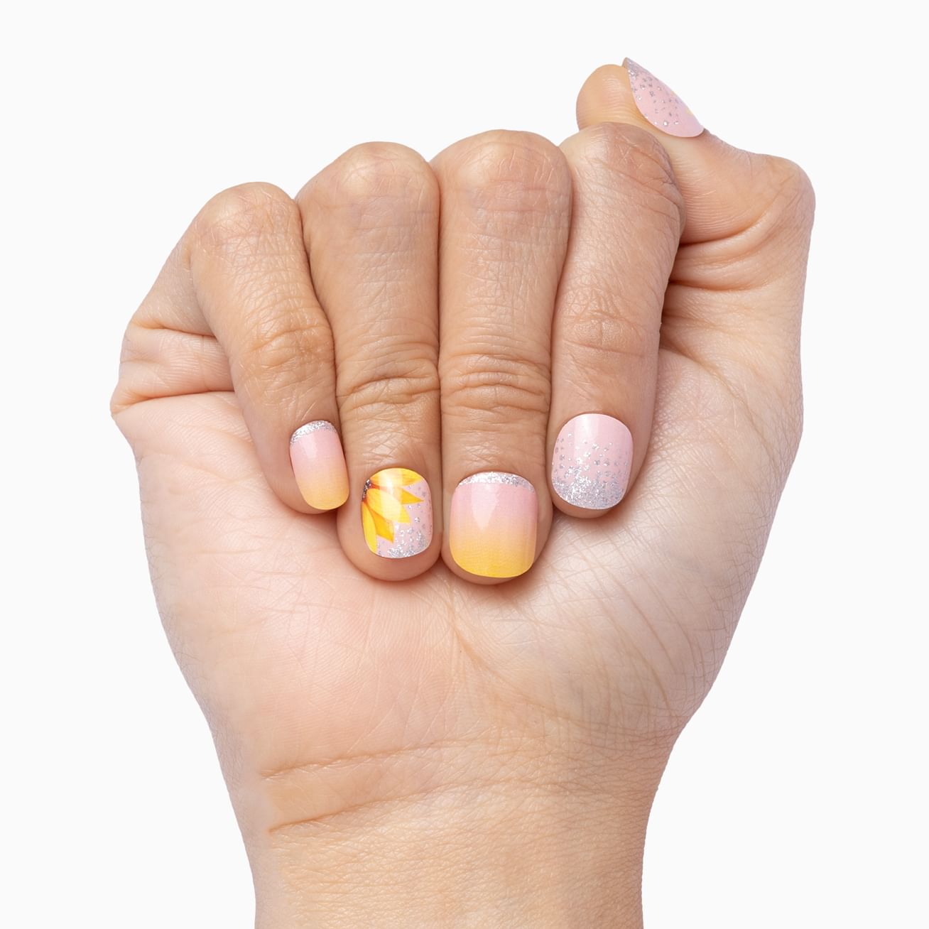 Blow Me Away combines gold glitter accents with windswept maple leaves, boughs, and branches for a manicure that says, "it's fall, y'all." With the design right at the cuticle, these are picture-perfect on short nails and give glam leaf peeps on longer fingertips. You'll be blown away by how quickly and easily these can be applied.