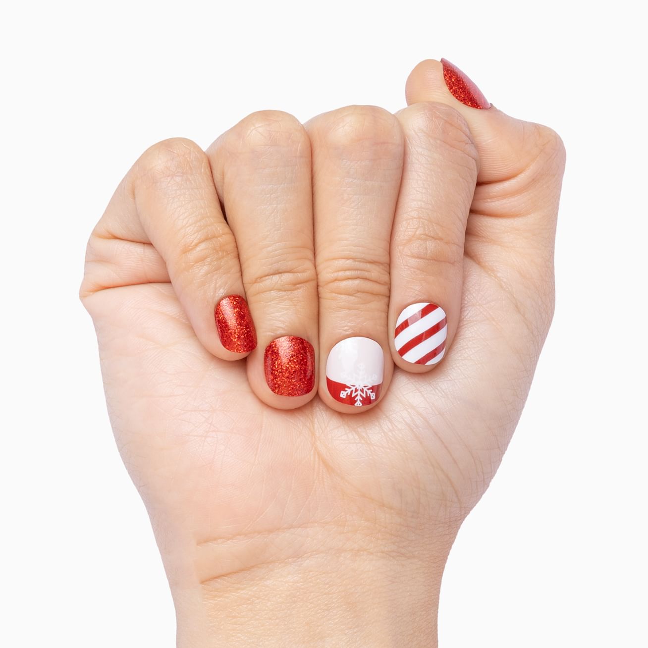 With so many red nail moments for the holiday season, it's sometimes hard to choose. With Wrapped in Red, you get all the season's best looks with red glitter, snowflakes on French tips, and candy-cane stripes. Pop this set on in minutes for a manicure that stands up to gift wrapping (or unwrapping) for weeks!