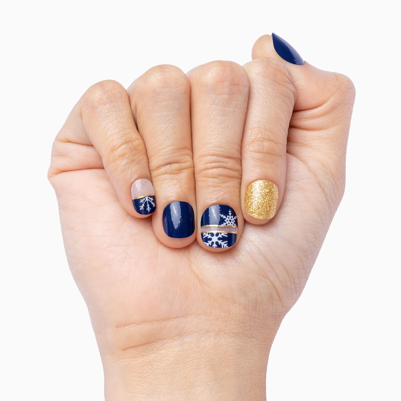 Merry Little Christmas combines rich, glossy navy blue with white snowflakes and gold glitter. The white stripes are transparent to let your natural nail peek through. Have yourself a merry little manicure a little longer by topping off this look with top coat.