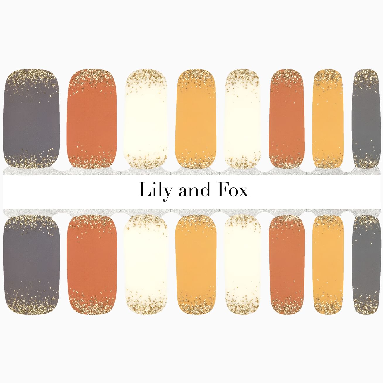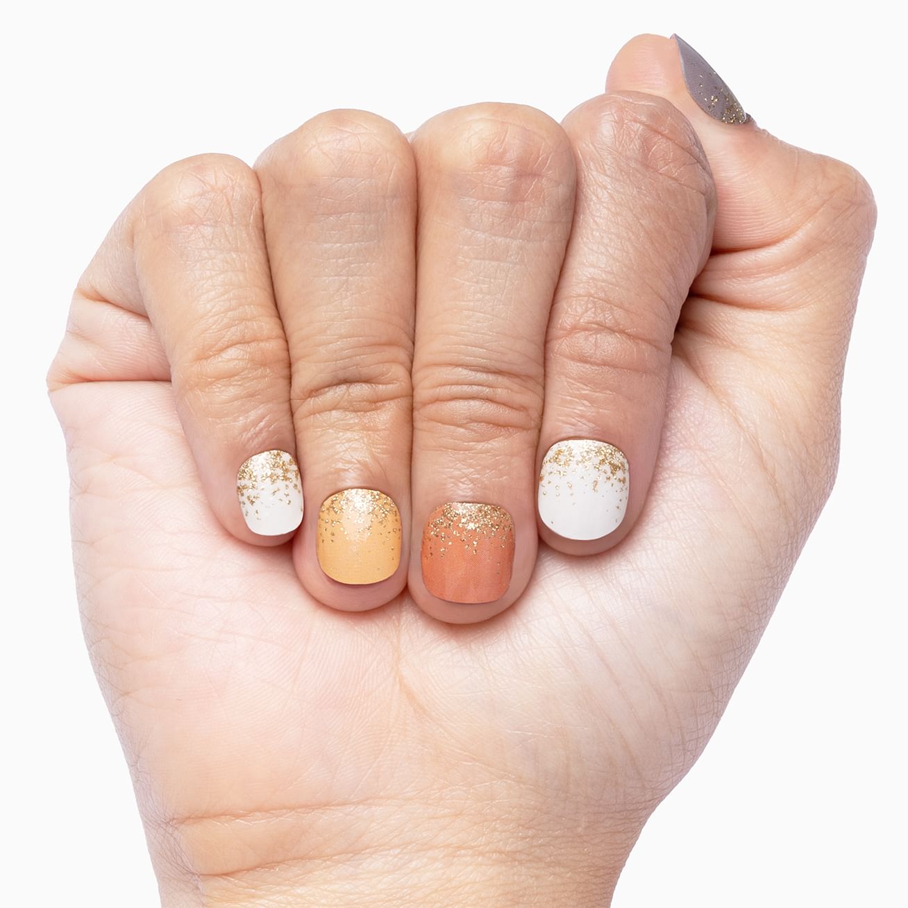 Champagne Kisses is the perfect mixed fall manicure in glossy oranges, yellows, grays, and cream, with a peck of gold glitter hugging your cutie-cles. To extend the embrace of this already long-lasting, easy-to-apply manicure, add a base and top coat.
