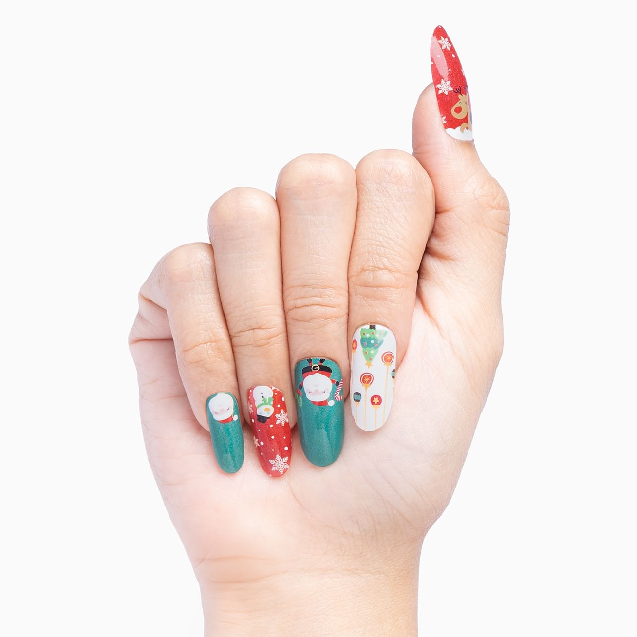 Christmas Time is here! This merry mani features adorable cartoon reindeer, Santa, holiday trees, snowflakes, and ornaments set against the glossy, classic red, green, and white backgrounds that give all the feelings of the stop-action and cartoon classic Christmas movies that are somewhere in our memories. Add a layer of top coat to extend Christmas Time's time on your nails.