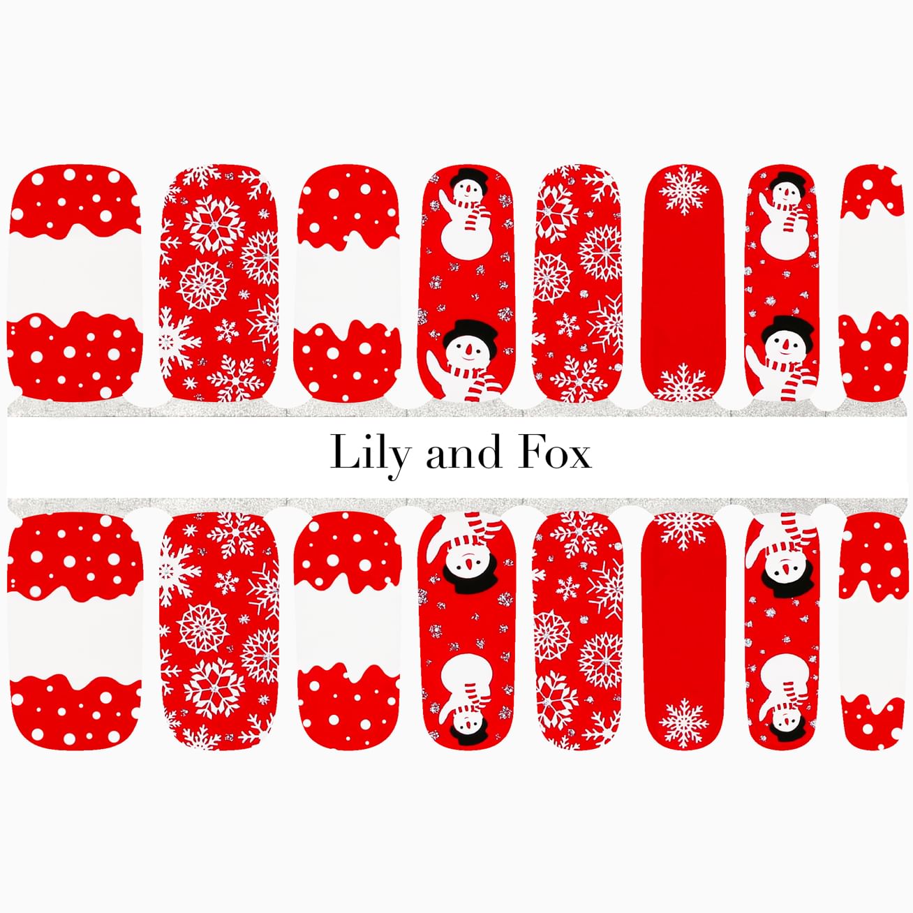 Deep Red Christmas features snow-melty French-like tips, snowmen, and snowflakes dotted with silver glitter accents. The red background is a true classic glossy red. The snowflakes and snowmen at the cuticle are small enough to to fit most short nails without cutting off the design. Extend the wear of this manicure by adding a layer of top coat.