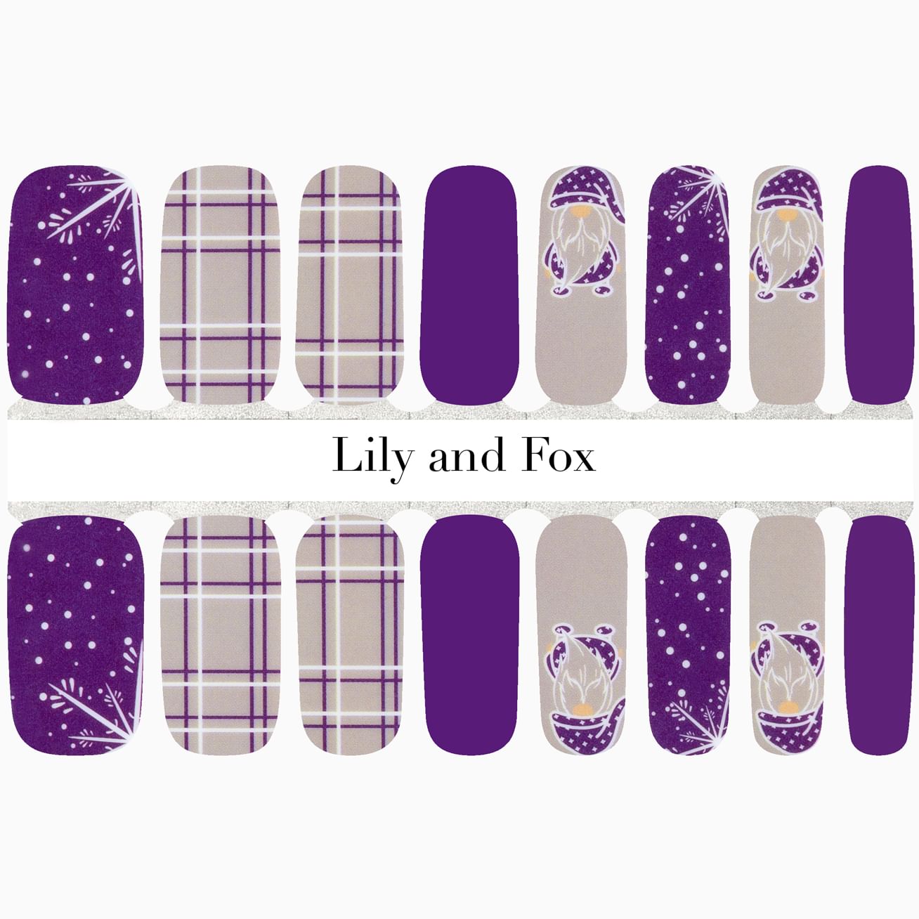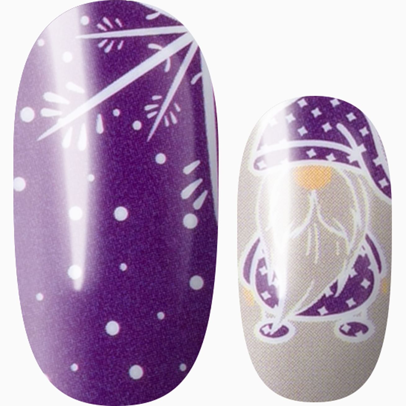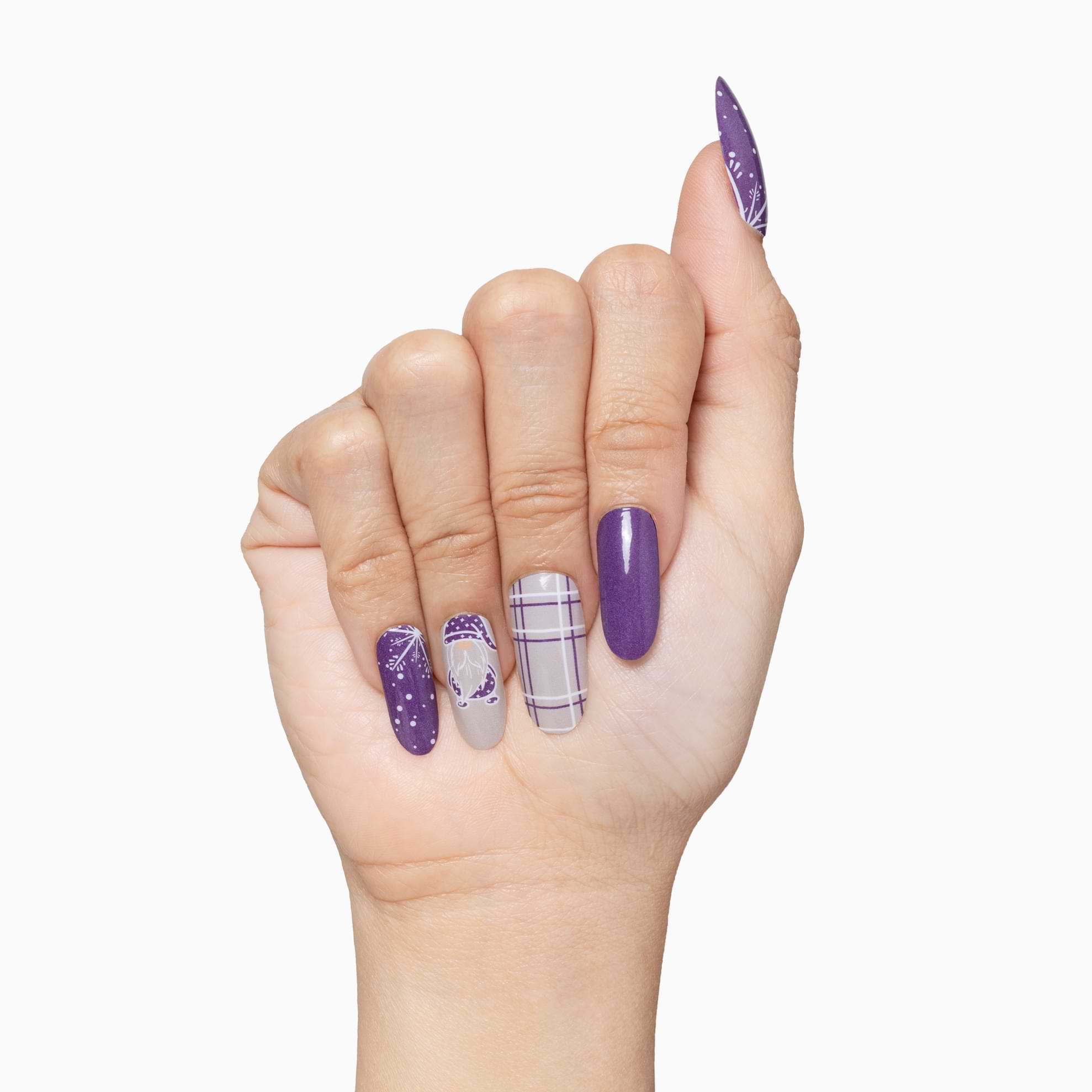 Enchanted Kingdom will bewitch you with its soft, gray wizardy-looking gnome clad in deep purple, starry attire. Additional designs in this set include a solid glossy purple, a purple and white plaid set against a gray background, and a white snowflake and dots against deep purple. Keep this magical mani going strong by adding a layer of top coat.