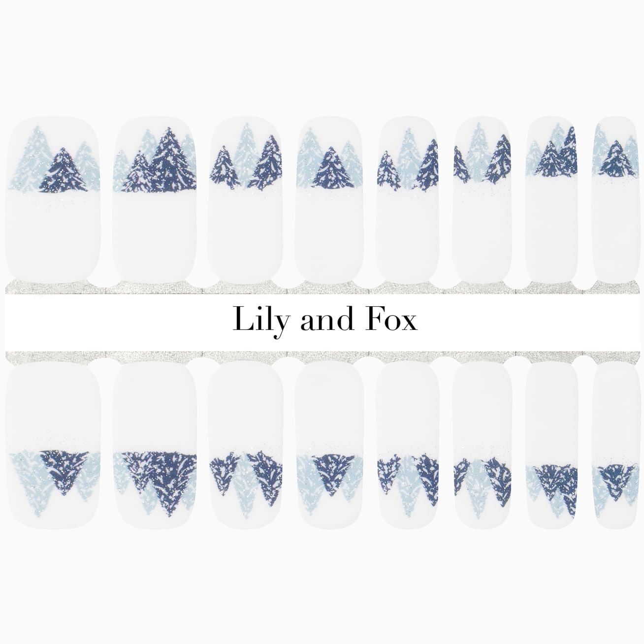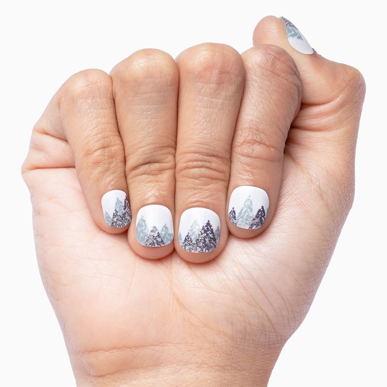 The snow glows white on these frosty trees tonight, not a footprint to be seen. The cold won't bother you with the glitter spiraling in frozen fractals all around. The trees hug the cuticle, perfect for short and long nails. Not ready to let this look go? Add a layer of top coat.