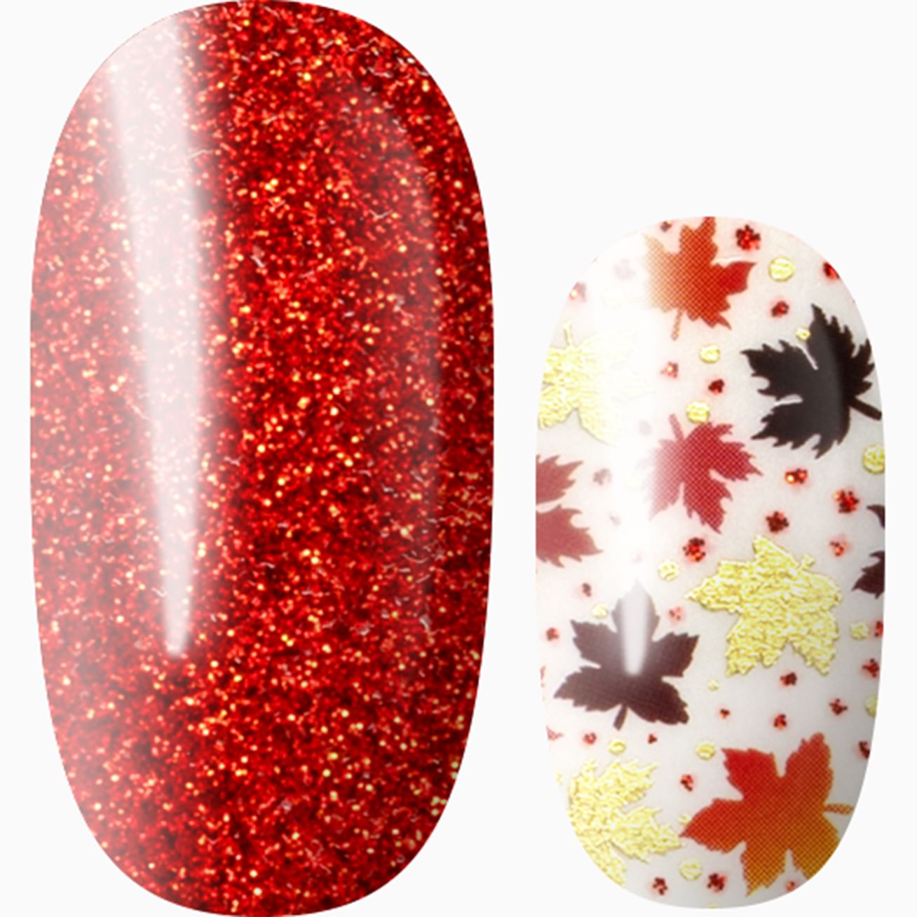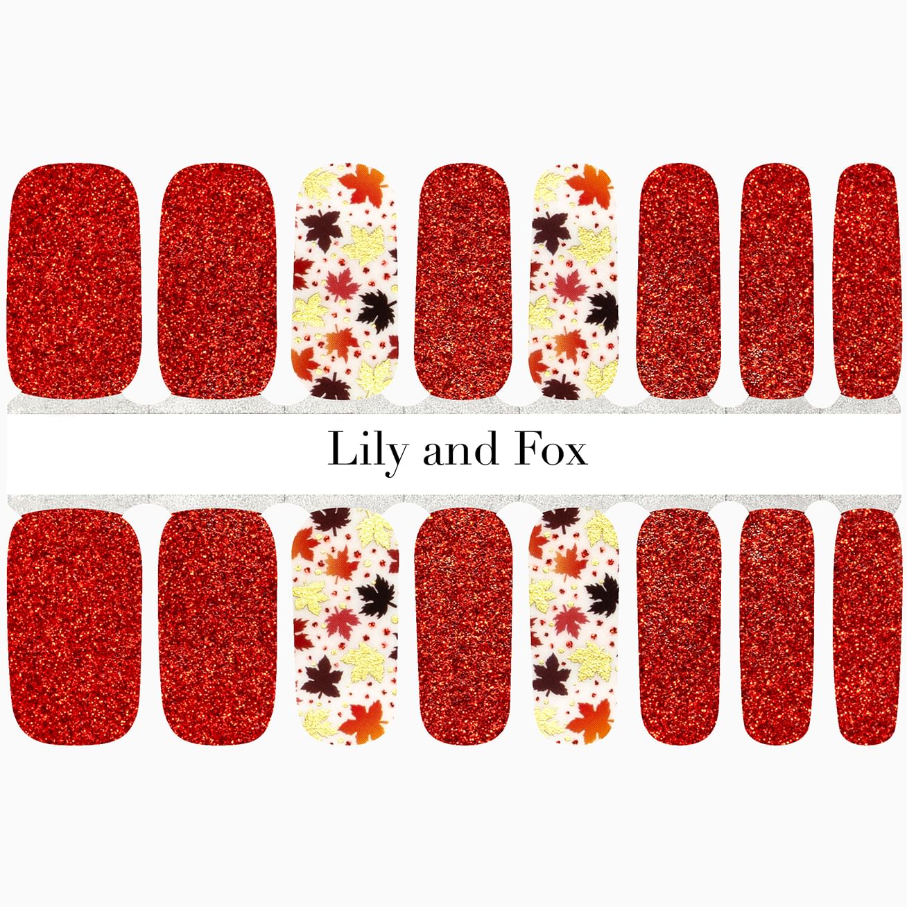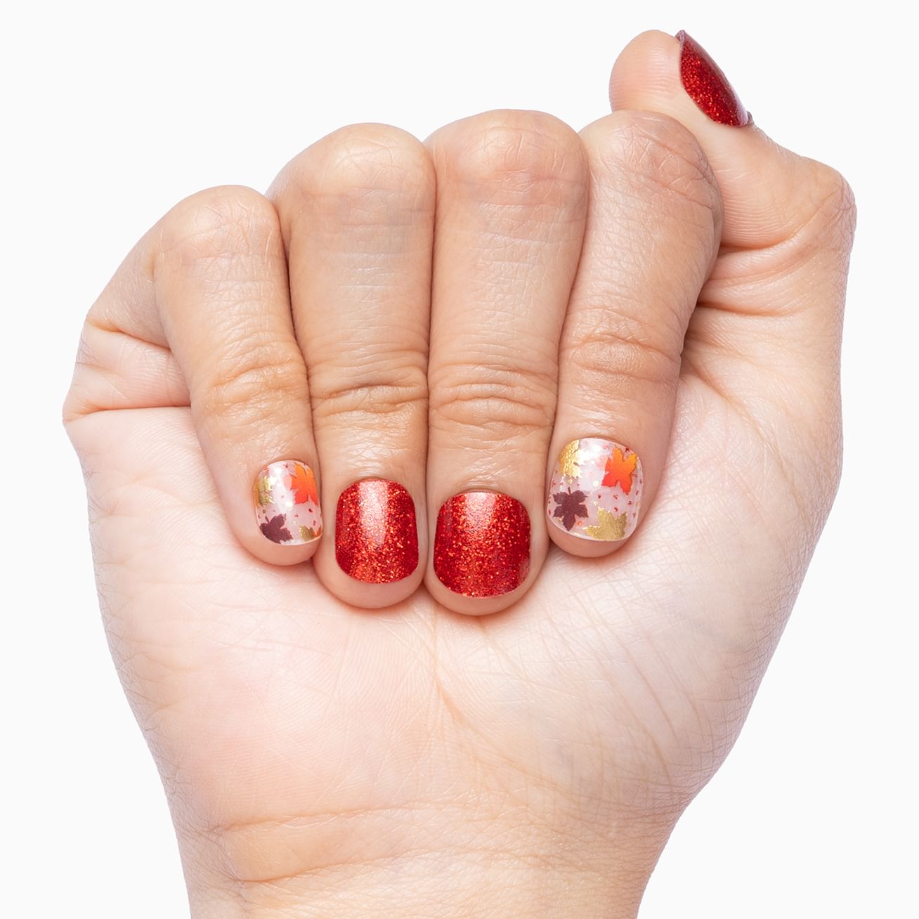 Goddess of Fall truly is a manicure sent from the heavens with its combination of red solid glitter, gloss, metallic, and transparent finishes! The leaves on the accent nails are a combination of gold metallic and glossy maple leaves set on a transparent background that lets your natural nail peek through. Add a layer of protective top coat for extra-long wear.