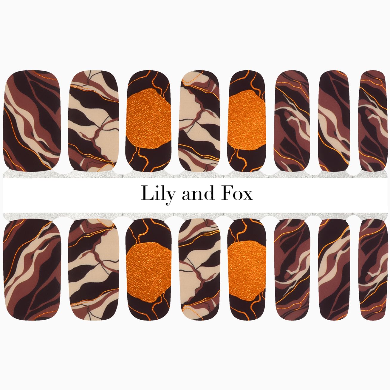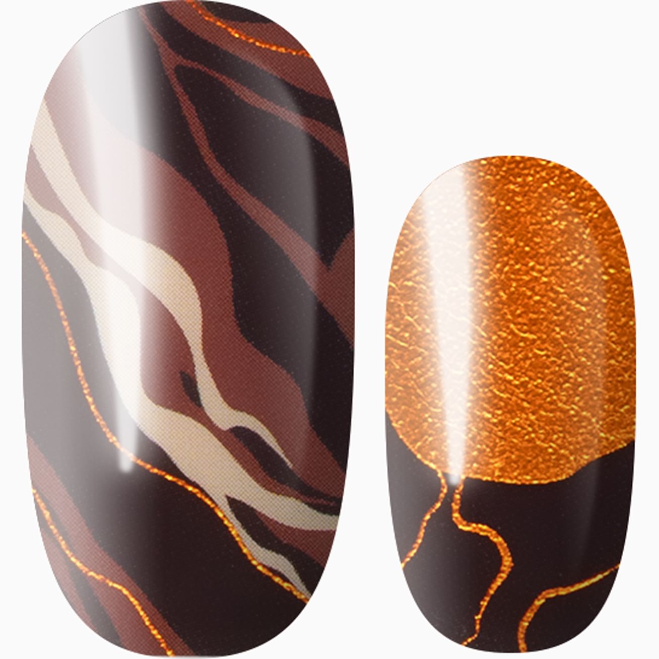 Mocha is definitely a mood with this beautifully marbled mani! Copper metallic veins cross through the rich chocolate, mocha, and cafe au lait browns and tops off an electrifying French-like tip accent. Keep this java jive vibing by adding a layer of top coat.