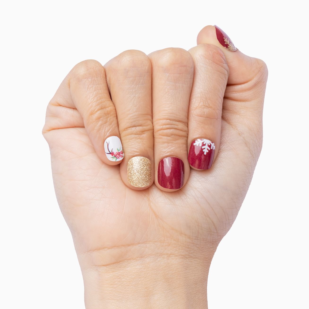 You can rule the holiday season with this beautiful mixed manicure set featuring deep, glossy reds topped with gold glitter snowflakes, a design featuring a hint of a white snowflake at the cuticle, full-glam gold glitter, and an accent wrap of reindeer antlers with a crown of roses set against a white background. Yes, queen! Extend your reign by adding a layer of top coat.