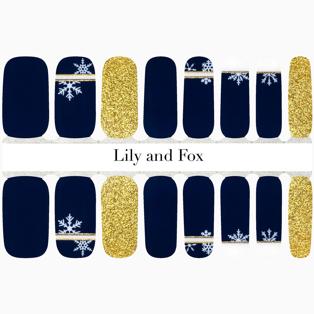 Merry Little Christmas combines rich, glossy navy blue with white snowflakes and gold glitter. The white stripes are transparent to let your natural nail peek through. Have yourself a merry little manicure a little longer by topping off this look with top coat.