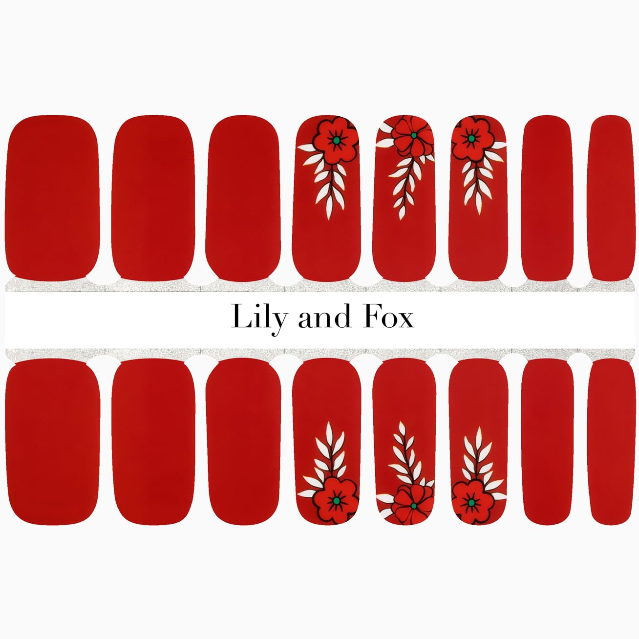 Passionate Petals feature a red floral design with dramatic white leaves cascading across the nail set against a classic red manicure. Fall in love with these wraps that pop on in minutes with more staying power than a fresh-cut bouquet.