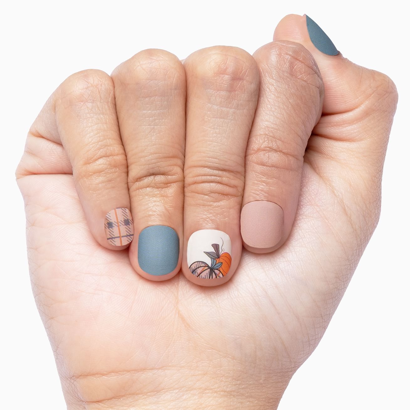 Gourdeous Gingham combines mauve and blue gingham with soft oranges in this cozy pumpkin set that defies the expected autumnal color palette. Extend the life of this manicure with a top coat - be sure to use a matte one to maintain the original finish of this nail wrap set.