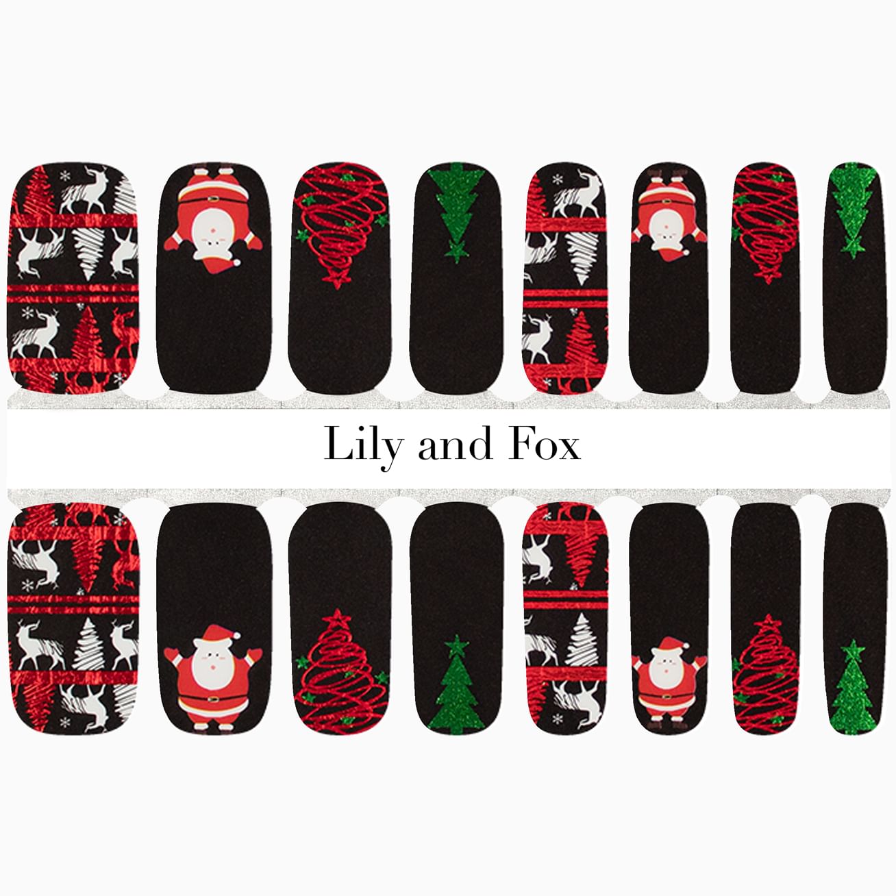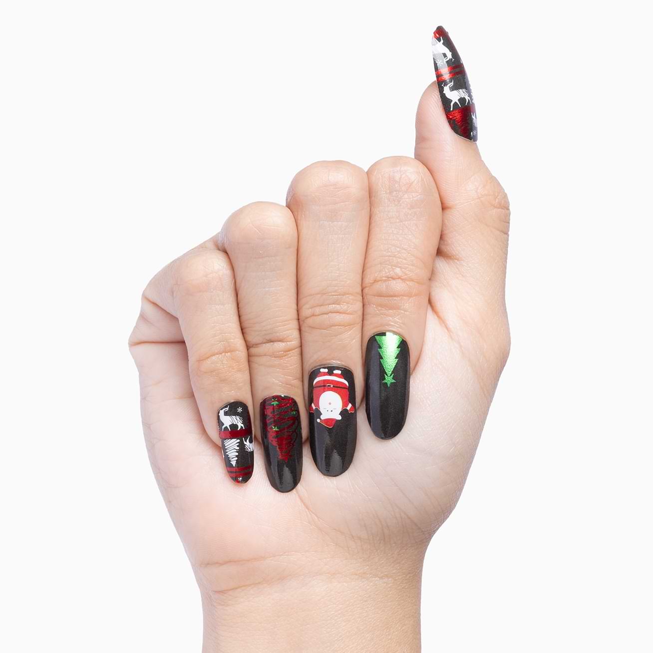 Oh Deer, you simply must try this exquisite glossy and metallic manicure. This set features a glossy black backdrop with reindeer and metallic trees that look hand-sketched. The green and red trees are metallic while Santa and the white reindeer designs are glossy. Please note that the larger metallic areas will look "cracked," this is by design. Keep this dear manicure going even longer by adding a top coat.