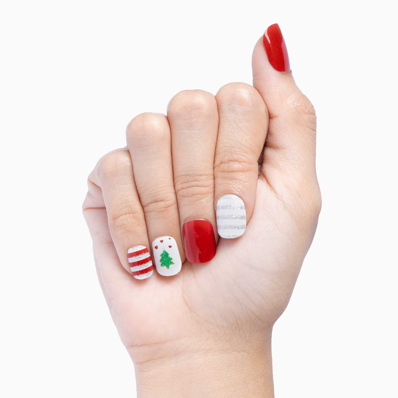 Let's be jolly! Rockin' Around the Christmas Tree features a mix of glittery stripes and Christmas tree, with glossy reds for a long-lasting manicure that is tough enough to deck the halls with boughs of holly. You will get a sentimental feeling when you hear all of the compliments on this festive holiday look.
