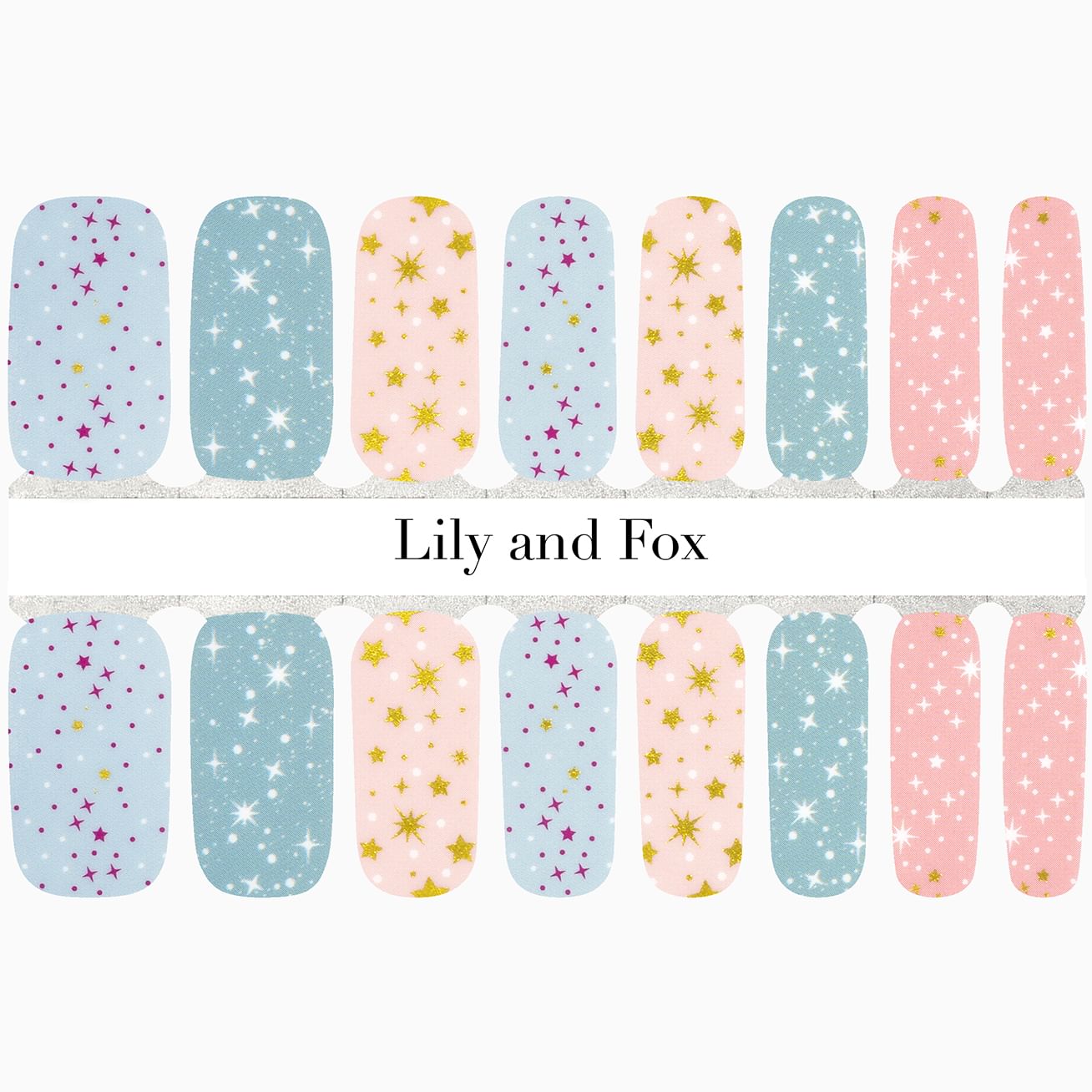 How I wonder why you're reading the description and not just adding this star-studded wrap to your cart already! This beautiful pastel set features glossy blue, turquoise, light pink, and medium pink wraps covered with white, magenta, and metallic gold stars. Keep the magic alive by adding a layer of top coat.