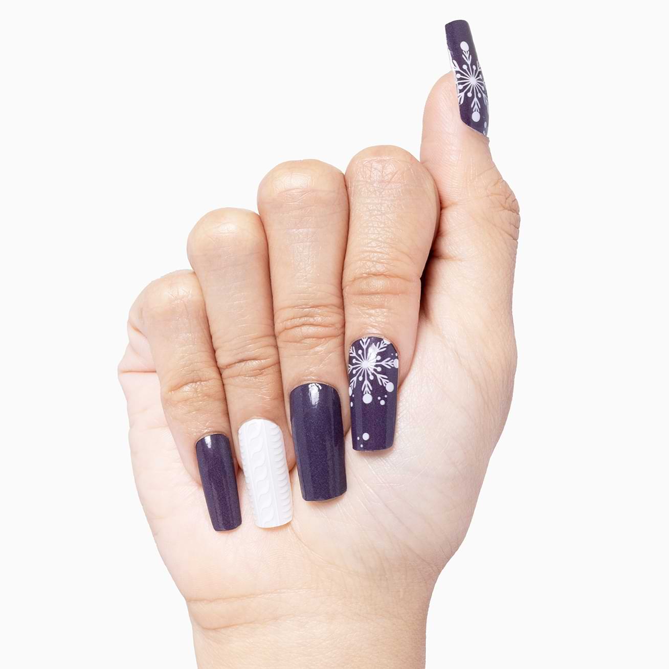 This wrap set will surely warm your heart with its cheerful white snowflakes against a deep purple background. The white-on-white accent nails whisper "sweater weather" with the subtle cable knit design. Perfect for long or short nails, this manicure can be applied in minutes and enjoyed for weeks.