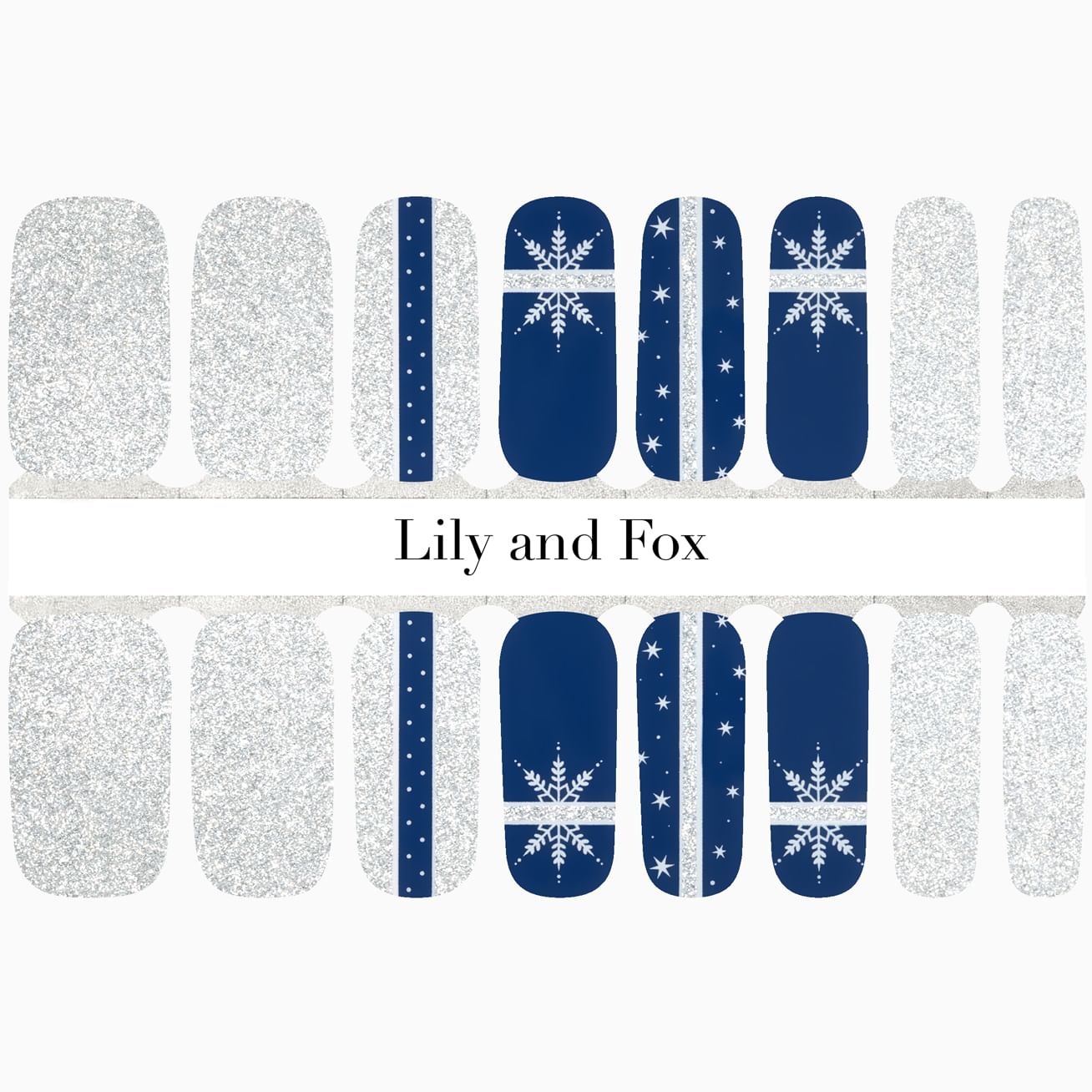 Winter Sparkle pairs silver glitter solids with snowflakes, stars, and stripes set against a glossy deep blue background. Add a top coat to give extra staying power to this already long-lasting manicure.