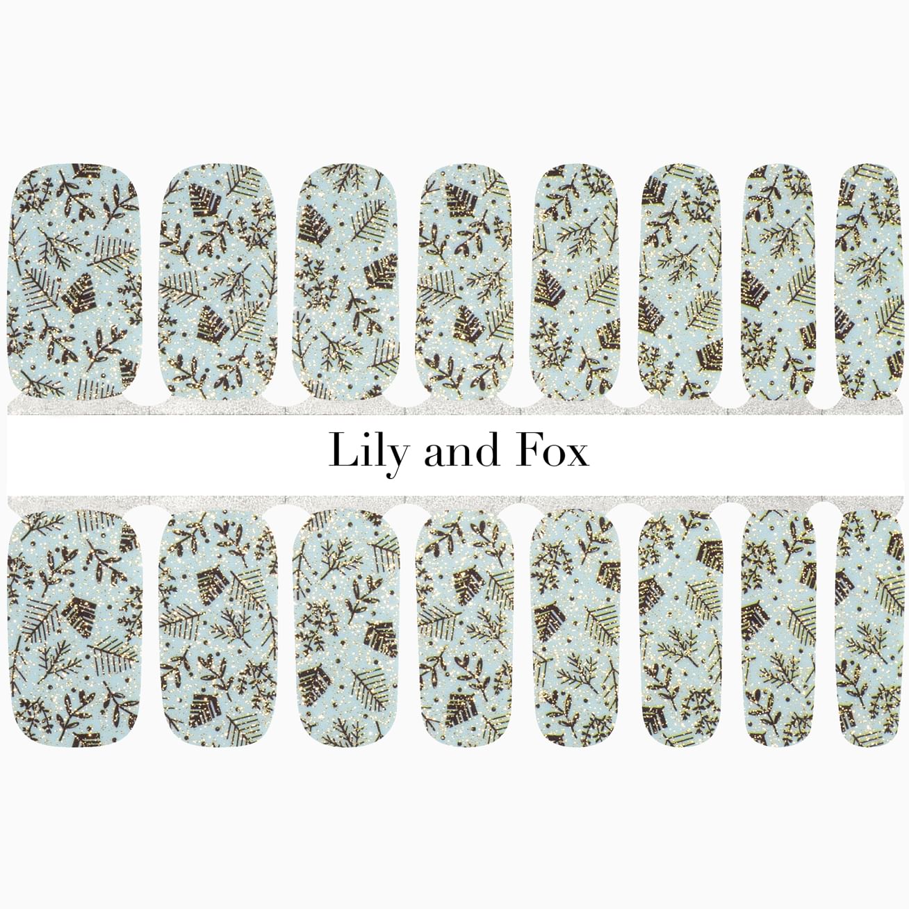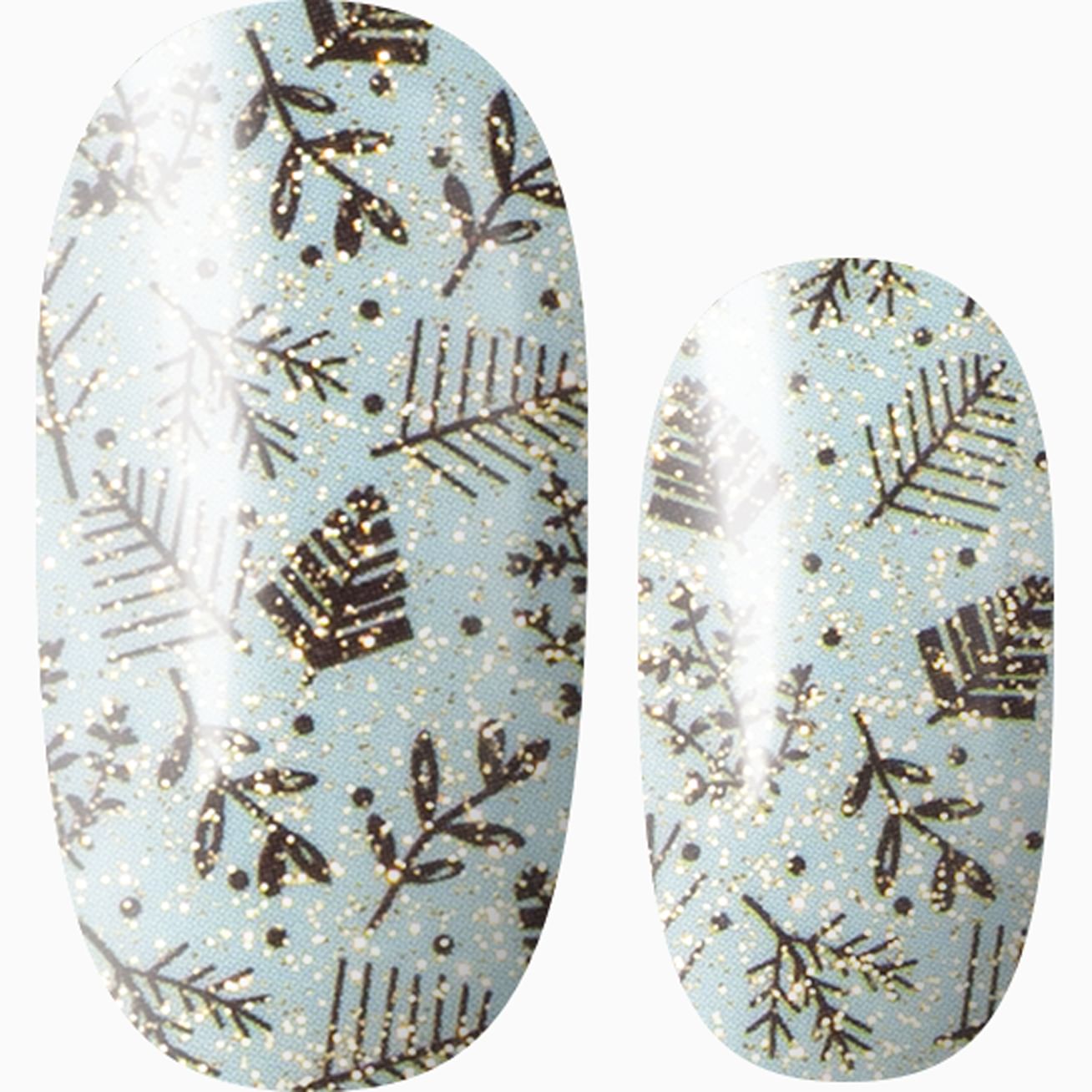 The Winter Whispers nail wrap is a manicure masterclass in subtle design with dainty chocolate leaves cascading across an icy blue background topped with a hint of golden glitter. Did you just hear that? The nail wraps just quietly said to add a base coat and top coat if you want to extend their wear!